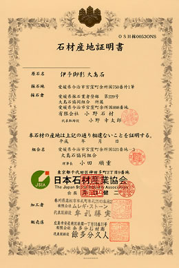 伊予大島石、庵治石でご建立のお客様にはご安心いただくために、「産地証明書」を発行しております。